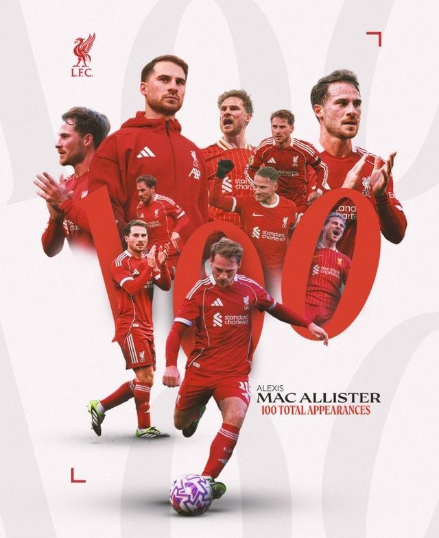 麦卡利斯特迎来利物浦生涯百场里程碑之战,此前99场比赛,阿根廷人打进14球并送出14次助攻。