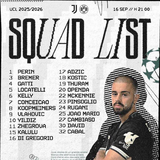 9月16日德甲日报讯 2025-26赛季欧冠联赛阶段第一场比赛,尤文图斯将在主场迎战多特蒙德,比赛在北京时间9月17日凌晨3点进行。尤文图斯官方公布了这场比赛的大名单,新援乔纳森·戴维、奥彭达等人领衔,上一轮意大利德比中绝杀国米的小将阿季奇入选。