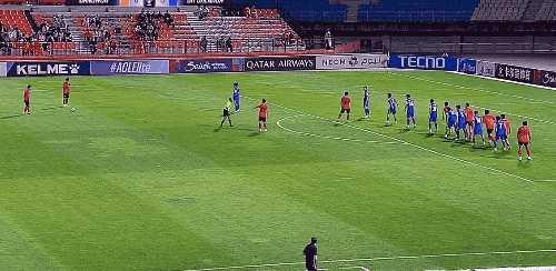 第32分钟,江原FC获得前场任意球,后卫赵炫泰包抄铲射,皮球击中边网。