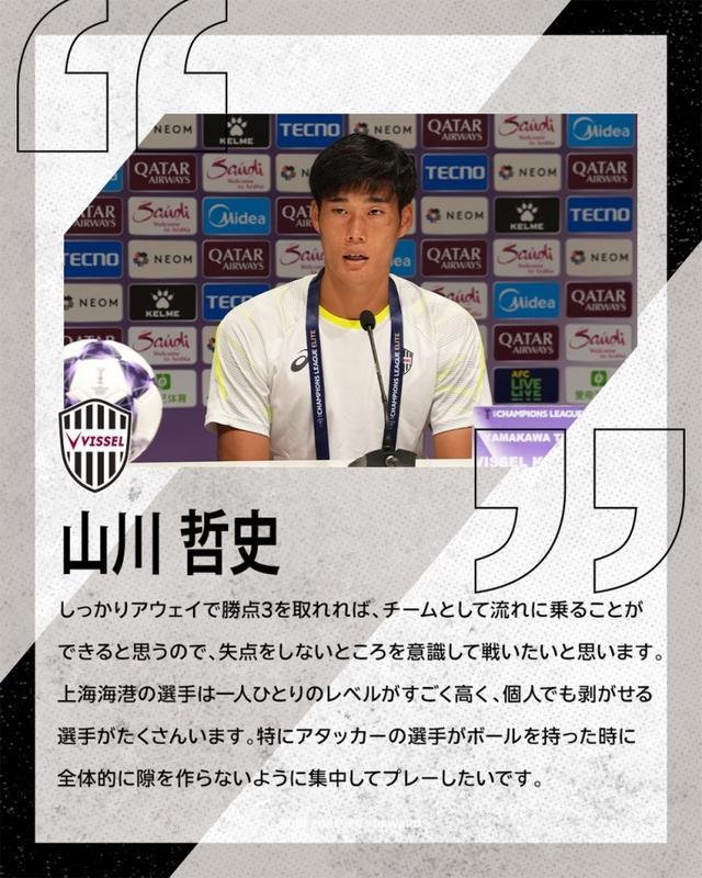 赛前,神户胜利船队长山川哲史表示:“如果能稳稳在客场全取3分,我觉得球队就能乘势而上了。所以我们会注重防守、力争不丢分。上海海港每个球员的个人能力都非常强,有很多能独自突破防线的球员。尤其当对方前锋持球时,我们必须全神贯注、保持整体阵型不留破绽。”
